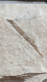 While working in the lobby at work I noticed what appears to be a tree fossil imprint in a sandstone block. The building was built over 50 years ago and the lobby has its side walls surfaced with mortared sandstone blocks that are of varying sizes and are probably about 12 cm thick. The fossil is about 8 cm long and 1 cm wide.