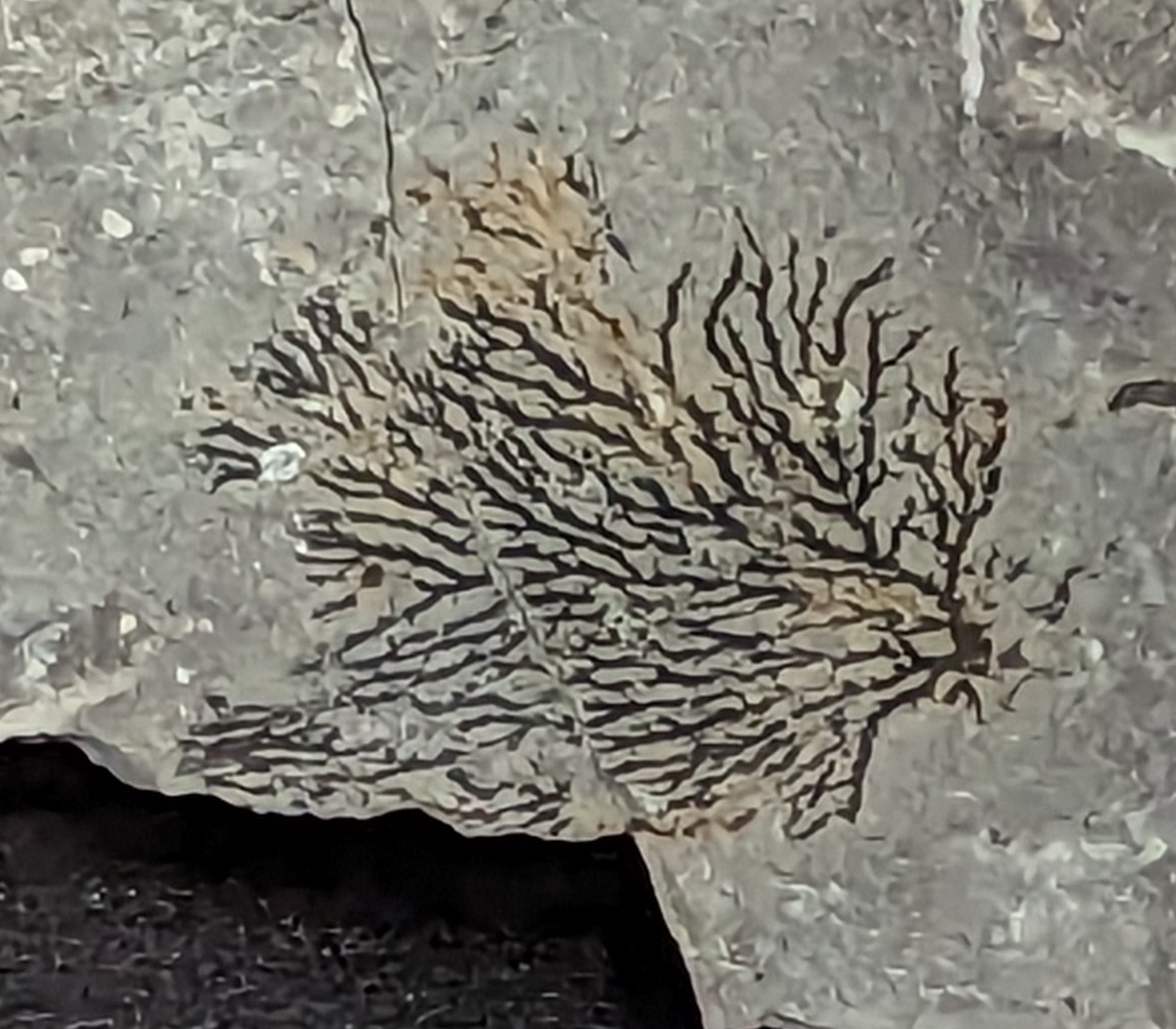 This post is a fossil called Desmograptus sp. (Hopkinson, 1875) graptolite. Fossil found in the Waldron Shale of Clark County Indiana USA. It dates to the Silurian Period. The fossil is black due to carbon-film preservation.Fossil on display at Falls of the Ohio Interpretative Center Clarksville Indiana USA as of December 2022.